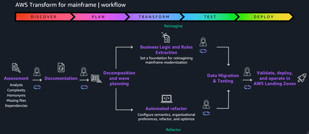 In May, 2025, we launched AWS Transform for mainframe, the first agentic AI service for modernizing mainframe workloads at scale... The AI-powered mainframe agent accelerates mainframe modernization by automating complex, resource-intensive tasks across every phase of modernization—from initial assessment to final deployment... You can streamline the migration of legacy mainframe applications, i...