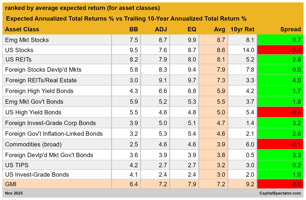 Long-term expectations for the Global Market Index (GMI) are holding at a 7%-plus annualized total return, based on data through November...2% annualized return that GMI has generated over the past ten years...6% annualized total return for the long-run outlook, which is 5...4 percentage points below its trailing ten-year return...For perspective on how GMI’s realized total return has evolve...