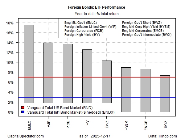 Echoing the strong run in foreign equities in 2025, bond markets ex-US are also having a good year...The leading offshore performing sector this year: government bonds issued in emerging markets (without hedging foreign-currency risk) via the VanEck Emerging Markets Bonds ETF (EMLC), which is up 17...Even the weakest foreign bond group – government bonds in developed markets ex...