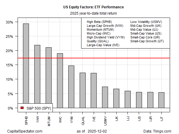 As the trading year heads into its final weeks, so-called high-beta shares remain firmly in the lead for US equity risk factors in 2025, based on a set of ETFs through Tuesdayâs close (Dec...SPHBâs bull run this year leaves the rest of the factor field in the dust...Meanwhile, small-cap stocks remain laggards in the factor horse race this year... The weakest of the weak: small-...
