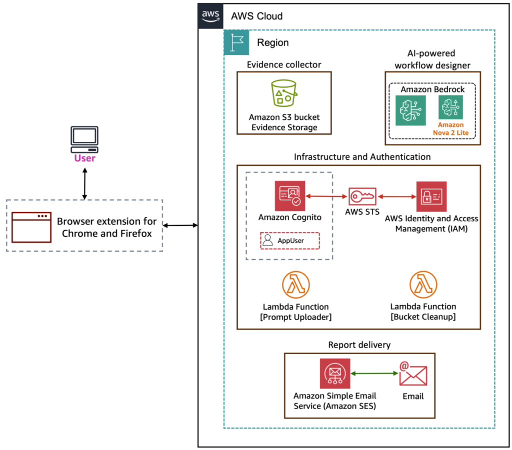 This post demonstrates how we automated audit workflows using Amazon Bedrock and browser automation... You will learn the architecture decisions, implementation details, and deployment process that can help you automate your own compliance workflows... Your extension will execute pre-defined compliance workflows, automatically capture timestamped screenshots, and store organized evidence in Amazo...