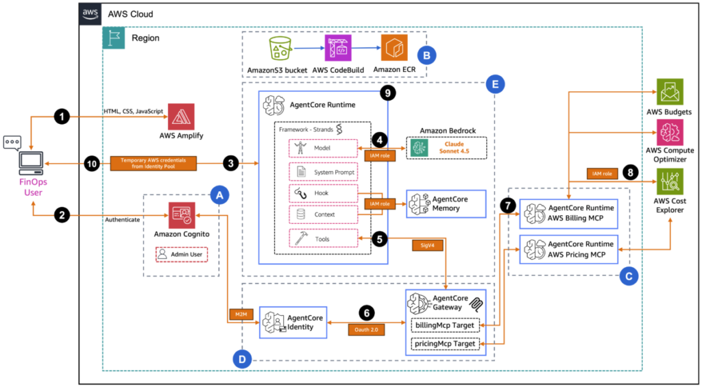In this post, you learn how to build a FinOps agent using Amazon Bedrock AgentCore that helps your finance team manage AWS costs across multiple accounts... The solution uses AgentCore, Anthropic Claude Sonnet 4...5, the Strands Agent SDK, and the Model Context Protocol (MCP)... Solution overview This solution consists of two main components: the authentication and frontend layer and the Ama...