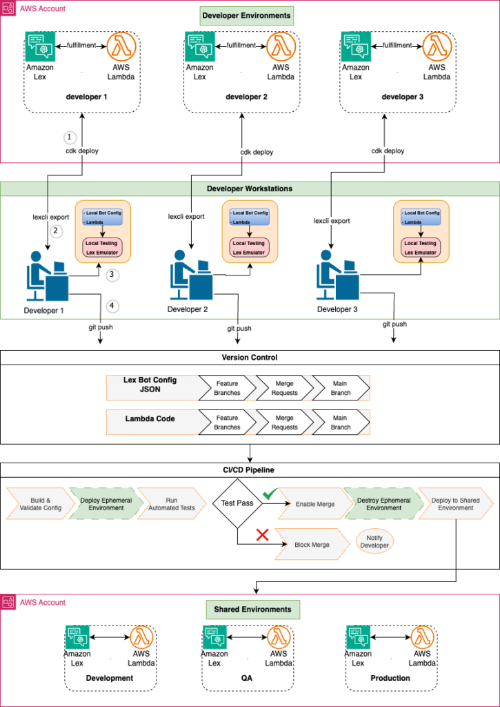 Scaling Amazon Lex development requires isolated environments, version control, and automated deployment pipelines... In this post, we walk through a multi-developer CI/CD pipeline for Amazon Lex that enables isolated development environments, automated testing, and streamlined deployments... Developers then test and debug locally using lex_emulator, a custom tool providing integrated testing fo...