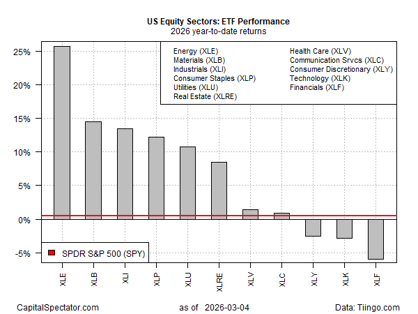 Driven by rising oil and gas prices, energy shares are the leading sector performer by far, based on a set of ETFs through yesterday’s close (Mar...Materials (XLB) and industrials (XLI) are distant second‑ and third‑place sector performers this year, followed by consumer staples (XLP), utilities (XLU), and real estate (XLRE)... The remaining sectors are close to flat or und...