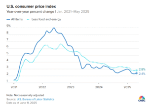 Yesterday’s consumer inflation report for May, by comparison, was muted. The year-over-year change for CPI at the headline level ticked down to 2.4%, moderately above the Fed’s 2% inflation target. Core CPI, a more robust measure of the trend, held steady, which could be a sign that pricing pressure will remain “sticky” at a time when tariffs are only just starting to factor into prices.