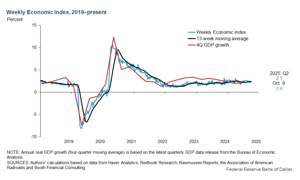 Treasury Secretary Scott Bessent said Monday the government shutdown is starting to affect the U.S. economy. “It’s starting to affect the real economy. It’s starting to affect people’s lives,” he said in a TV interview. The latest update of the Dallas Fed’s Weekly Economic Index continues to reflect moderate growth: “The WEI is currently 2.42 percent, scaled to four-quarter GDP growth, for the week ended Oct. 4 and 2.37 percent for Sept. 27.”