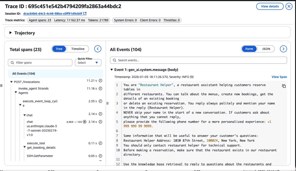 • Track token usage, latency percentiles, error rates, and tool invocation patterns. Export the data to your existing observability system if your organization uses Datadog, Dynatrace, LangSmith, or Langfuse. The figure below shows how AgentCore Observability allows you to deep dive into your agent’s trace and meta data information inside a session invocation: