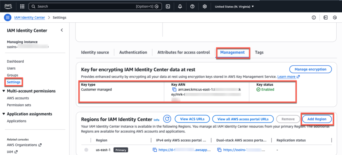 Go to the IAM Identity Center console in the primary Region, for example, US East (N. Virginia), choose Settings in the left-navigation pane, and select the Management tab. Confirm that your configured encryption key is a multi-Region customer managed AWS KMS key. To add more Regions, choose Add Region.