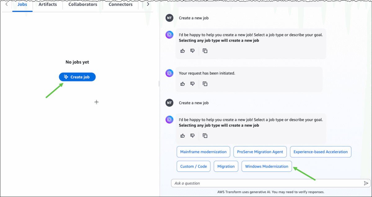 To get started with AWS Transform, I first complete the onboarding steps outlined in the getting started with AWS Transform user guide. After onboarding, I sign in to the AWS Transform console using my credentials and create a job for full-stack Windows modernization.