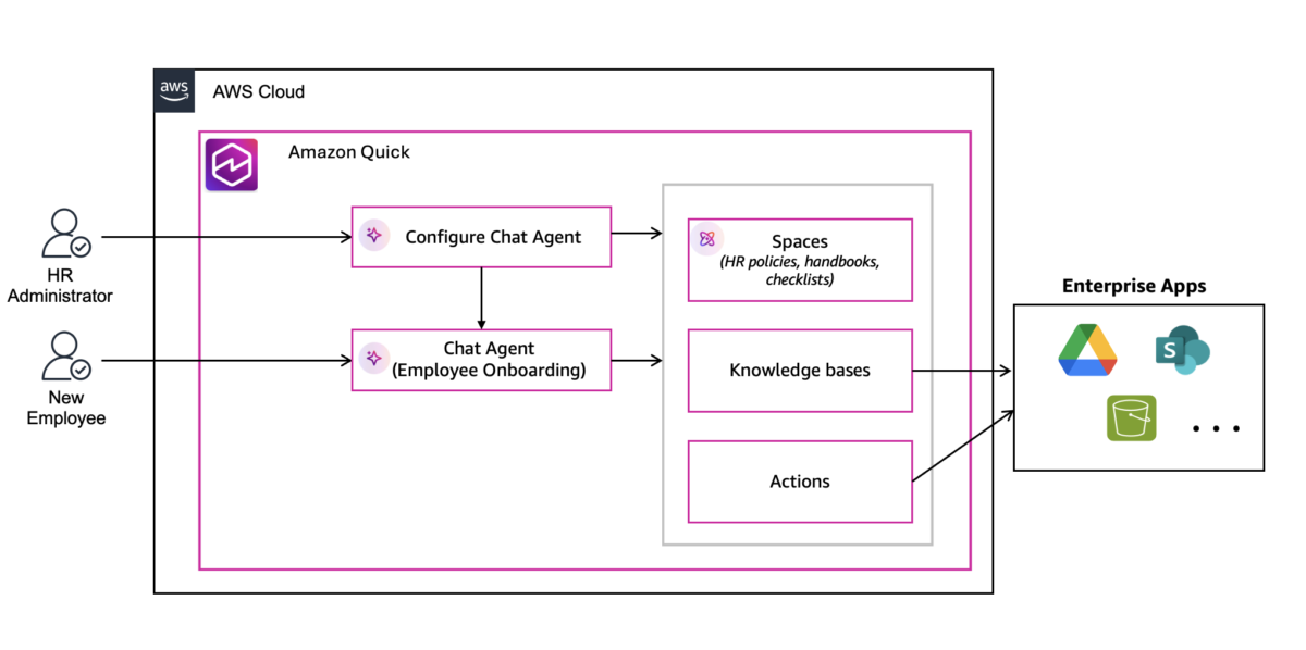In this post, we walk through building a custom HR onboarding agent with Quick. We show how to configure an agent that understands your organization’s processes, connects to your HR systems, and automates common tasks, such as answering new-hire questions and tracking document completion. You can adapt this solution to your onboarding workflow so new hires get consistent answers and HR teams reclaim time previously spent on routine inquiries.