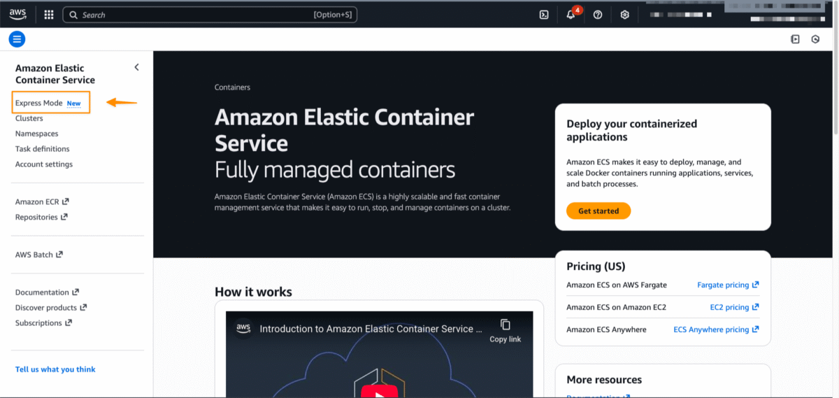 You can get started with Amazon ECS Express Mode by navigating to the Amazon ECS console.