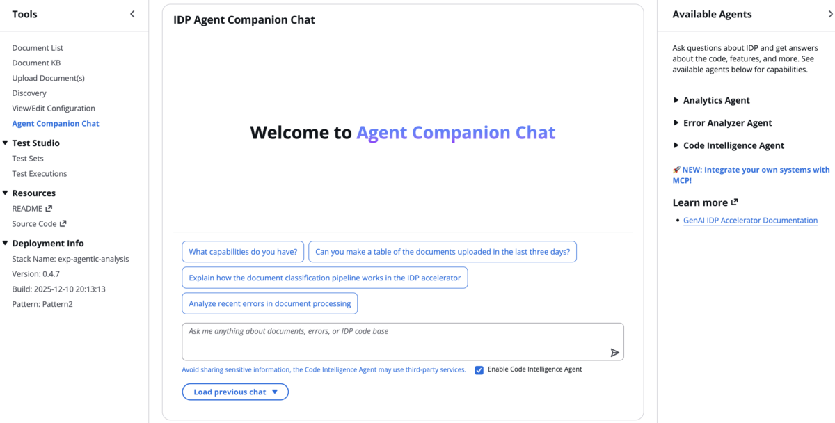 Now, using natural language queries through the Analytics Agent feature, you can extract valuable information to understand the performance of the solution. To access this feature, simply deploy the latest version of the GenAI IDP Accelerator and choose Agent Companion Chat in the navigation pane, as shown in the following screenshot (from accelerator version 0.4.7). Queries related to analytics automatically get routed to the Analytics Agent.