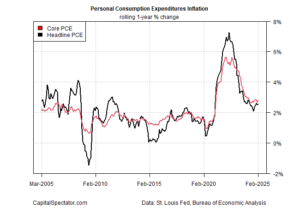 The future’s uncertain, but the past is always clear, and so it’s useful to consider how stocks have performed over some historical period that reduces noise relative to a “risk-free” benchmark. Let’s use the US 10-year yield as a proxy for a “safe” asset. Buying and holding a 10-year Note assures earning something close to the current yield if the security is held through maturity. For comparison, the chart below plots the rolling 10-year annualized return for the S&P 500 Index against the current 10-year yield. (S&P 500 and 10-yield data for March 2025 are as of Mar. 28).