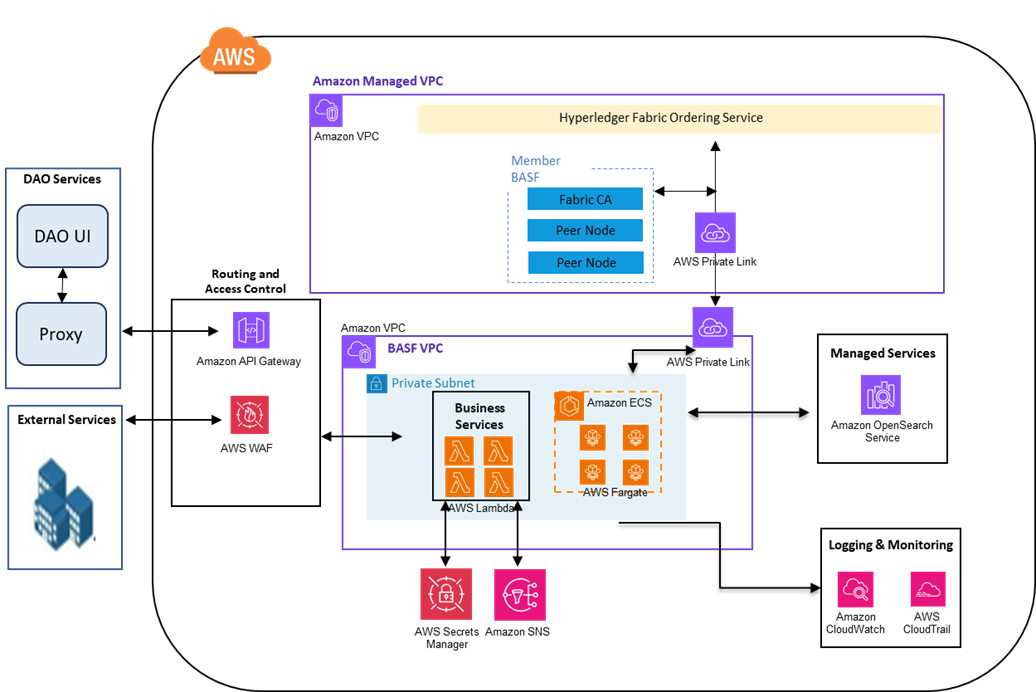 To focus on building such a system rather than managing the underlying blockchain infrastructure, BASF selected Amazon Managed Blockchain alongside additional AWS services. Amazon Managed Blockchain simplifies BASF’s approach because it brings a suite of offerings that can be configured to build this solution without the need to add more layers and external or internal sources.
