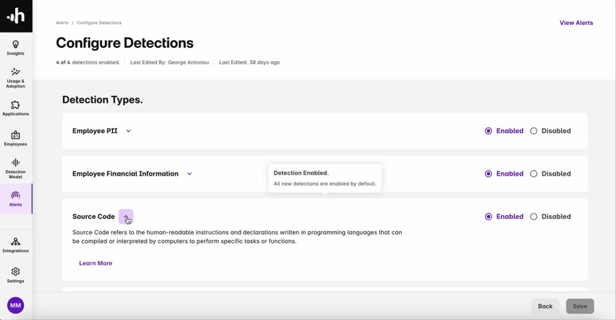 The following screenshot demonstrates Harmonic Security’s software tool, highlighting the different data leakage detection types, including Employee PII, Employee Financial Information, and Source Code.