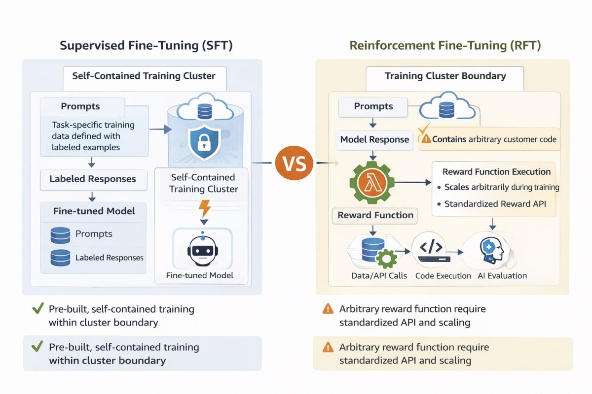 Amazon Nova offers multiple customization approaches, with Reinforcement fine-tuning (RFT) standing out for its ability to teach models desired behaviors through iterative feedback. Unlike Supervised fine-tuning (SFT) that requires thousands of labeled examples with annotated reasoning paths, RFT learns from evaluation signals on final outputs. At the heart of RFT lies the reward function—a scoring mechanism that guides the model toward better responses.