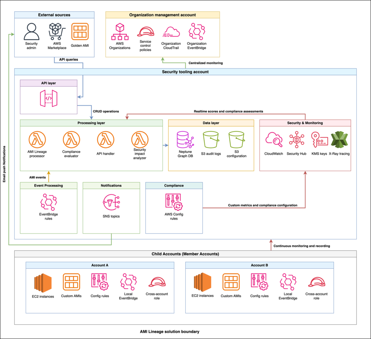 The AMI Lineage solution operates through a continuous monitoring and automated response system that maintains comprehensive visibility into your AMI landscape. When AMI lifecycle events occur in your organization, EventBridge rules capture these activities, including creation, copying, modification, and deregistration events. Lambda functions in the security tooling account are then called upon to process these events with appropriate security controls and update the Neptune graph database in real-time, while CloudTrail logs provide a comprehensive audit trail of AMI-related activities.