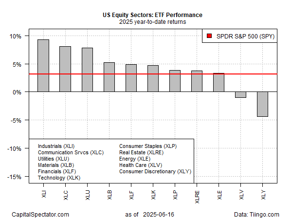In a year of shocks, turmoil, and tariffs, investor sentiment has been whipped to and fro as the crowd struggles to assess the outlook for risk and reward. But as 2025 approaches its mid-point, stocks in the industrial sector have found their footing and are now the performance leader, based on a set of ETFs through Monday’s close (June 16).