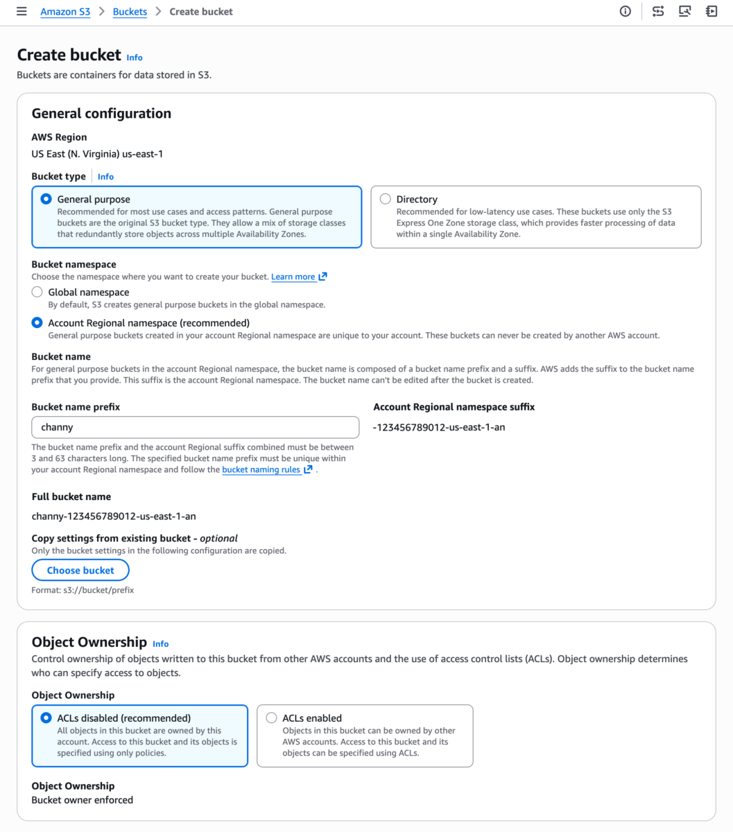 With this feature, you can predictably name and create general purpose buckets in your own account regional namespace by appending your account’s unique suffix in your requested bucket name. For example, I can create the bucket mybucket-123456789012-us-east-1-an in my account regional namespace. mybucket is the bucket name prefix that I specified, then I add my account regional suffix to the requested bucket name: -123456789012-us-east-1-an. If another account tries to create buckets using my account’s suffix, their requests will be automatically rejected.