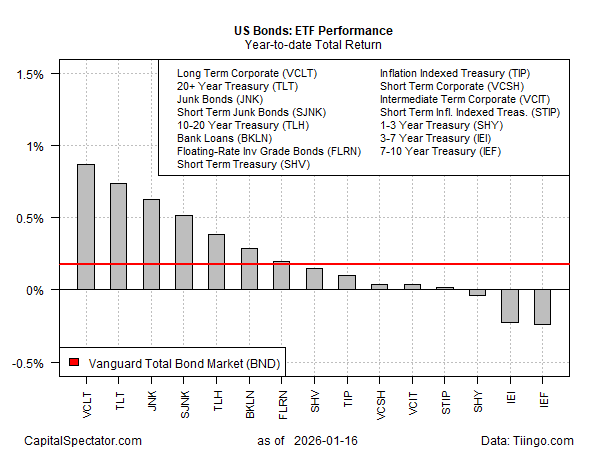 Topping the return ledger in 2026: long-term corporates, based on Vanguard Long-Term Corporate Bond ETF (VCLT), which is up 0.9% year to date. Long-term governments (TLT) are a close second with a 0.7% rise. Both funds are running comfortably ahead of the US investment-grade bond benchmark via Vanguard Total Bond Market (BND), currently ahead by 0.2%.