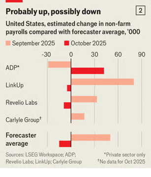 The US Labor Department said it will release the delayed payrolls report for September this week, on Thursday (Nov. 20). “The absence of timely official numbers left the markets and the Fed operating in a data fog, forced to scour alternate sources to gauge the underlying outlook,” Bank of America economist Shruti Mishra said in a note. “With the shutdown resolved, all eyes will now be on the incoming data dump.” The Economsit reports: “ADP’s numbers point to a decline in September, followed by a rebound in October. Those of Revelio Labs, a competitor, point to a rise in September and a decline in October.”