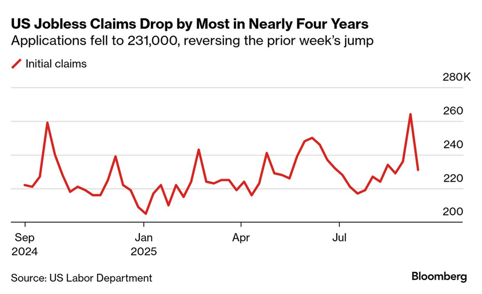 US jobless claims fell sharply, reversing the recent runup that lifted new filings for unemployment benefits to a four-year high during the previous week. “The decline is more noteworthy since claims in Texas, which drove a spike in the prior week, declined but remained elevated,” said Nancy Vanden Houten, lead US economist at Oxford Economics. “Sorting through the noise, initial claims are still consistent with a relatively low pace of layoffs.”
