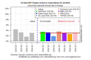 The rebound in US Treasury yields is fueled by firmer expectations that the economy will continue to grow in the near term, perhaps at a faster rate than recently expected, advises Apollo chief economist Torsten Sløk. He writes in a note to clients that the Federal Reserve will “reverse course” and leave interest rates unchanged at next policy meeting on Nov. 7. Although the Fed funds futures market overall disagrees and is pricing in a cut, Sløk reasons: “The US consumer continues to do well, driven by solid job growth, strong wage growth, and high stock prices and home prices… Look at the next nonfarm payrolls report. If we do get that at 150 or 200,000, we could easily get a scenario where the Fed will basically have to reverse course and begin to stay on hold.”