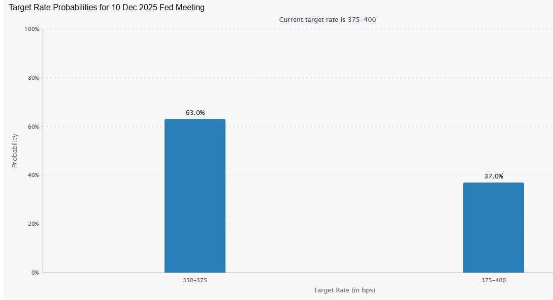 Federal Reserve Governor Stephen Miran says another rate cut is needed in December to lower US recession risk. “If you keep policy this tight for a long period of time, then you run the risk that monetary policy itself is inducing a recession,” he told The New York Times on Friday. “I don’t see a reason to run that risk if I’m not concerned about inflation on the upside.” The Fed funds futures market is pricing in a 63% probability for another 1/4-point rate cut at the next FOMC meeting on Dec. 10.