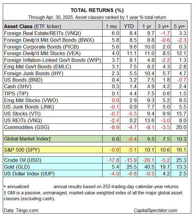 Foreign markets continued to rally in March, leading returns for the major asset classes and extending a bullish trend for foreign assets in 2025, based on a set of ETFs. US stocks, US junk bonds and US property shares, by contrast, continued to lose ground. The big loser in March: commodities, which posted an unusually steep decline.