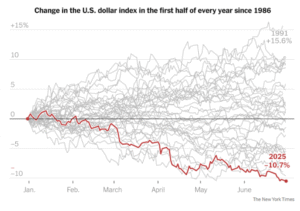 Year to date, foreign stocks in developed markets continue to enjoy a commanding lead for the major asset classes. Vanguard FTSE Developed Markets ETF (VEA) is up 20.7% year to date, well ahead of the second-best performer in 2025: foreign real estate shares (VNQI) with a 16.7% increase in 2025 through June 30.