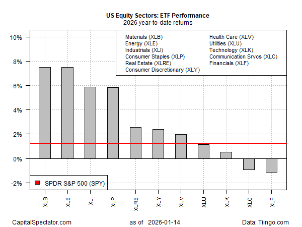 The ledger of stock market’s winners and losers is highlighting a substantially different race so far in 2026, based on a review equity sectors. The year is still young and so it’s unclear if a durable change in leadership is unfolding relative to last year’s bull run. But for now, it’s obvious that sentiment has shifted in favor of shares in the materials and energy sectors, based on a set of ETFs through yesterday’s close (Jan. 14).