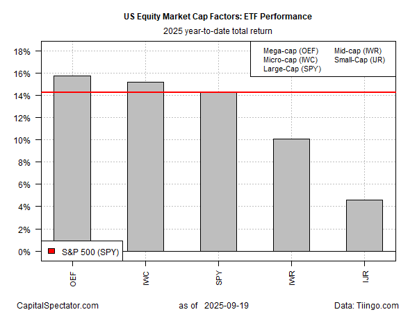 For much of the year, bigger has been better in terms of performance based on market cap. But the smallest tier of firms (micro-caps) are suddenly giving the biggest names (mega caps) a run for their money in year-to-date terms, based on a set of ETFs through Friday’s close (Sep. 19).
