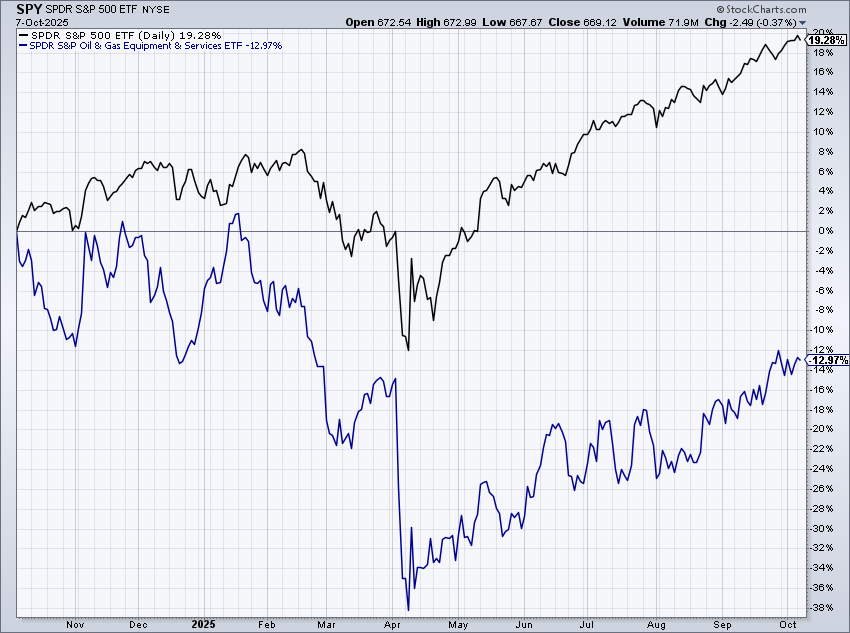 For perspective, each market is compared with the US stock market via SPDR S&P 500 (SPY), which has rallied 19... Although these stocks have recovered a fair amount of lost ground since the tariff selloff in April, the SPDR S&P Oil & Gas Equipment & Services ETF (XES) remains deeply under water this year...Health care stocks are sickly, too, although a rally in this co...