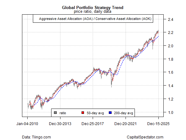 Extending signaling from recent history, the trend remains positive for the ratio of two global asset allocation ETFs via an aggressive strategy (AOA) vs...Risk-on signaling also rolls on for the US equity market, based on the ratio for a conventional measure of the US stock market (SPY) vs...A similar story applies to another dimension of investor sentiment for US stocks ...