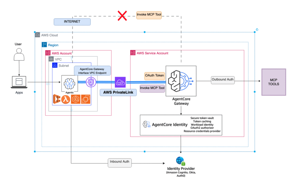 AgentCore Gateway, a modular service under AgentCore, simplifies integration by securely transforming APIs, AWS Lambda functions, and services into Model Context Protocol (MCP)-compatible tools and making them available to agents through a unified endpoint, with built-in authentication and serverless infrastructure that minimizes operational overhead... Amazon Web Services (AWS) interface VPC end...