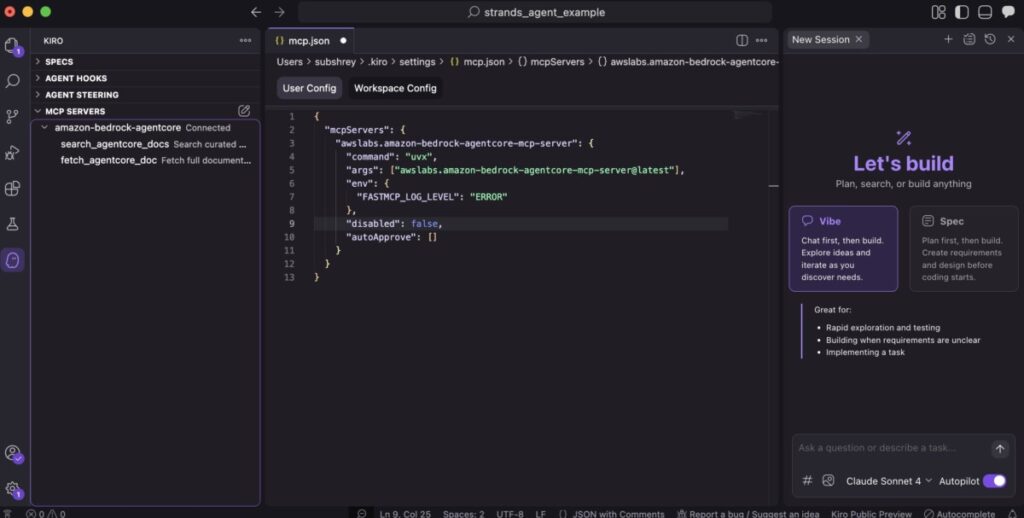 With built-in support for runtime, gateway integration, identity management, and agent memory, the AgentCore MCP Server is purpose-built to speed up creation of components compatible with Bedrock AgentCore... You can use the AgentCore MCP server for rapid prototyping, production AI solutions, or to scale your agent infrastructure for your enterprise... Agentic IDEs like Kiro, Claude Code, GitHub...