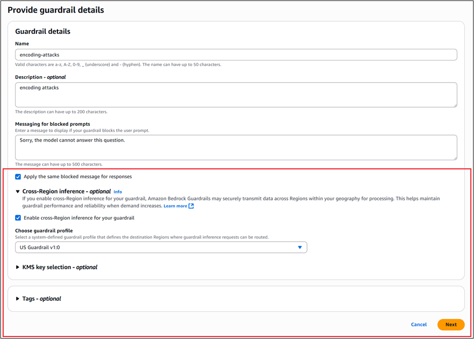In this example, we recommend Standard tier to provide higher accuracy, improved performance, and expanded language support when creating guardrails. To learn more, see Tailor responsible AI with new safeguard tiers in Amazon Bedrock Guardrails. To use Standard tier, you must enable Cross-Region inference.