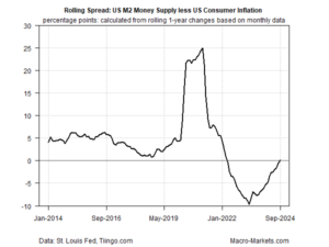 The risk appetite for US equities, however, rebounded sharply, based on the ratio for a broad equities ETF (SPY) vs. a low-volatility portfolio of stocks (USMV). Note, however, that this proxy remains below its July peak and so it’s not yet clear if the revival in bullish sentiment is on a sustainable path.