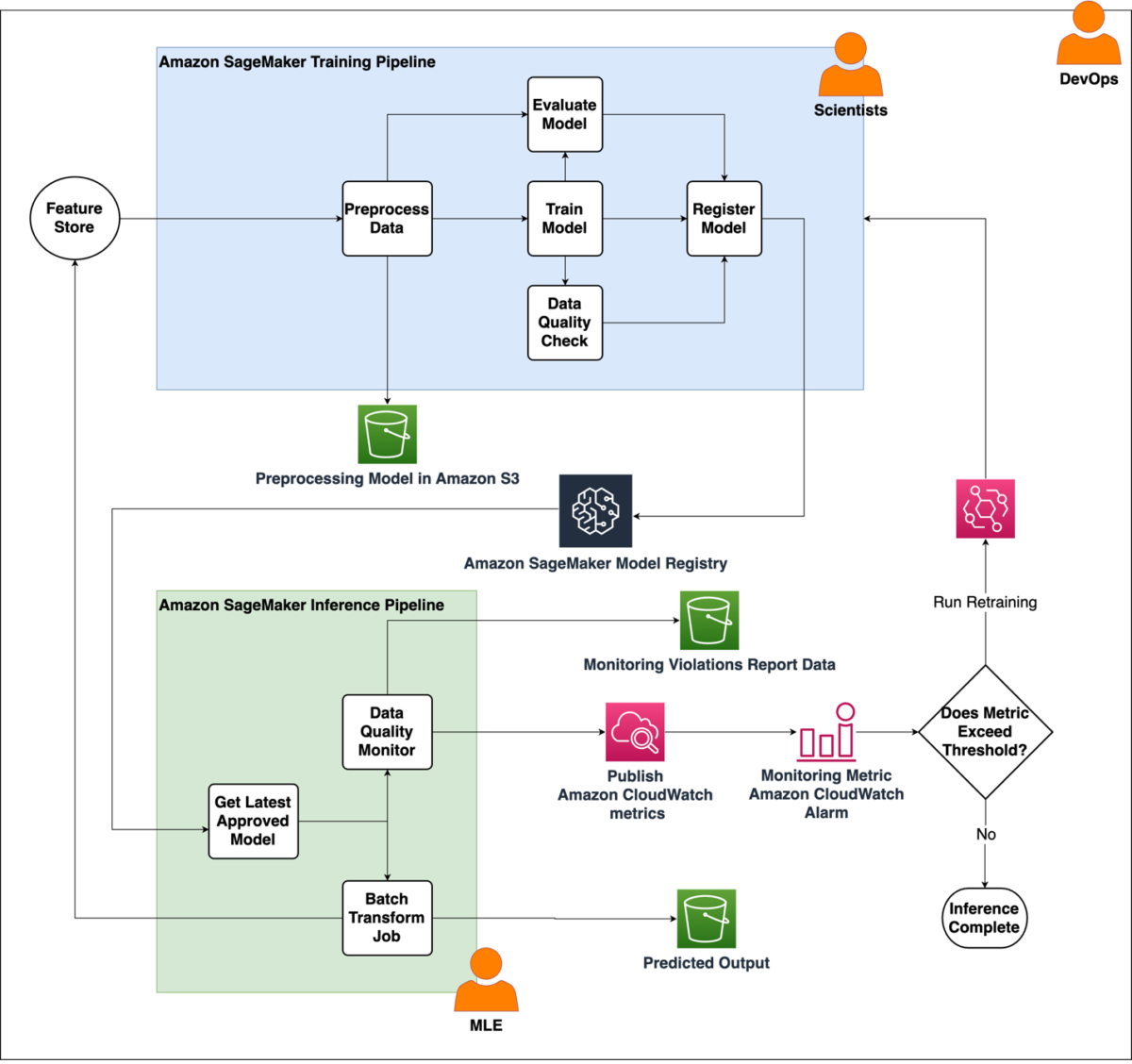 - Inference pipeline – The inference pipeline handles on-demand batch inference and monitoring tasks. Within this pipeline, SageMaker on-demand Data Quality Monitor steps are incorporated to detect any drift when compared to the input data. The monitoring results are stored in Amazon S3 and published as a CloudWatch metric, and can be used to set up an alarm. The alarm is used later to invoke training, send automatic emails, or any other desired action.