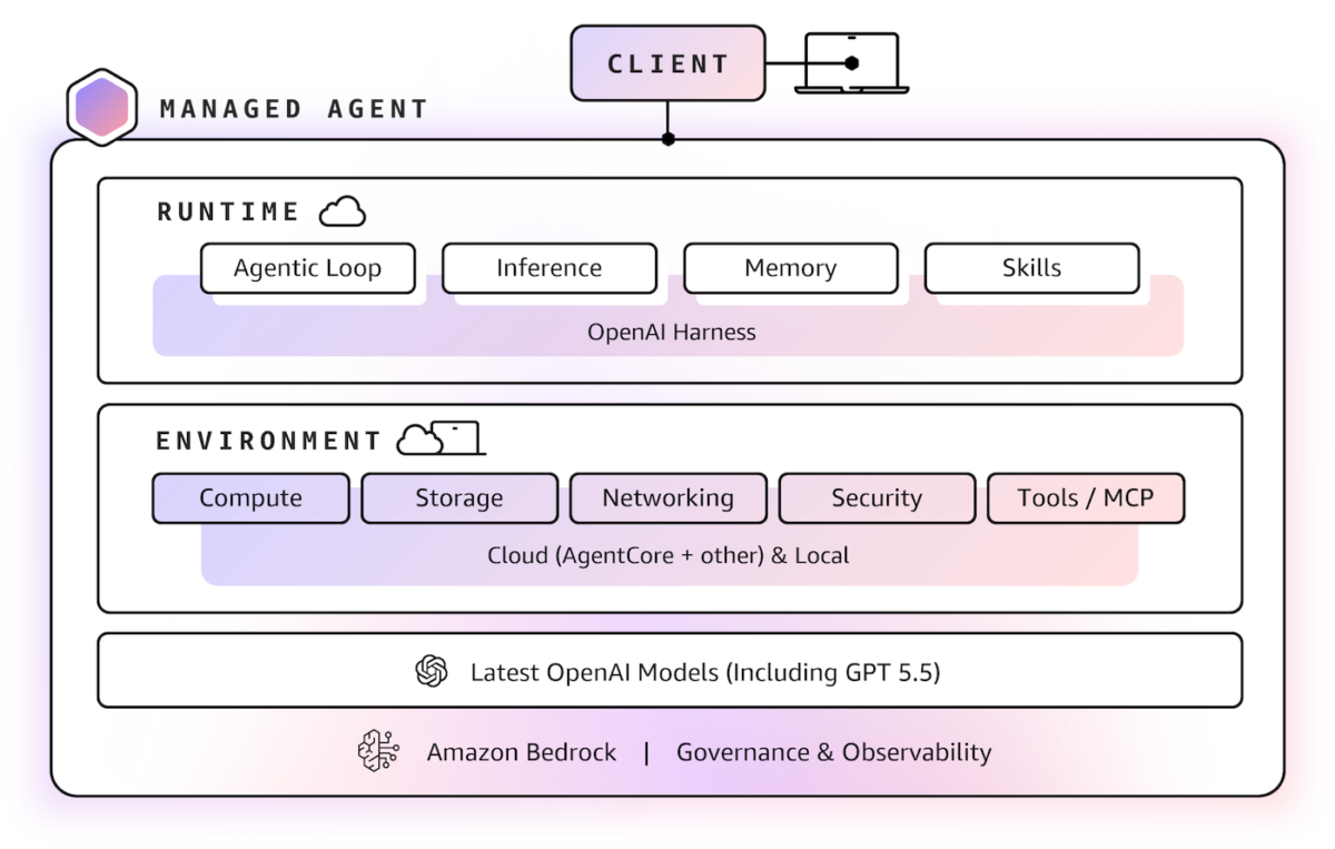 • Amazon Bedrock Managed Agents, powered by OpenAI (Limited preview): Amazon Bedrock Managed Agents combines frontier AI models with trusted AWS infrastructure, enabling customers to quickly and easily build production-ready OpenAI-powered agents in the cloud. It is built with the OpenAI harness, which is engineered to unlock the full potential of OpenAI frontier models, delivering faster execution, sharper reasoning, and reliable steering of long-running tasks.