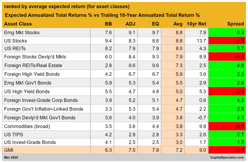 Roughly a third of GMI’s components are projected to generate weaker returns relative to their respective results over the past ten years (indicated by the red boxes in far-right column below). The same subpar performance applies to GMI, which is currently projected to earn a materially softer return compared with its realized performance for the trailing ten‑year window through March.