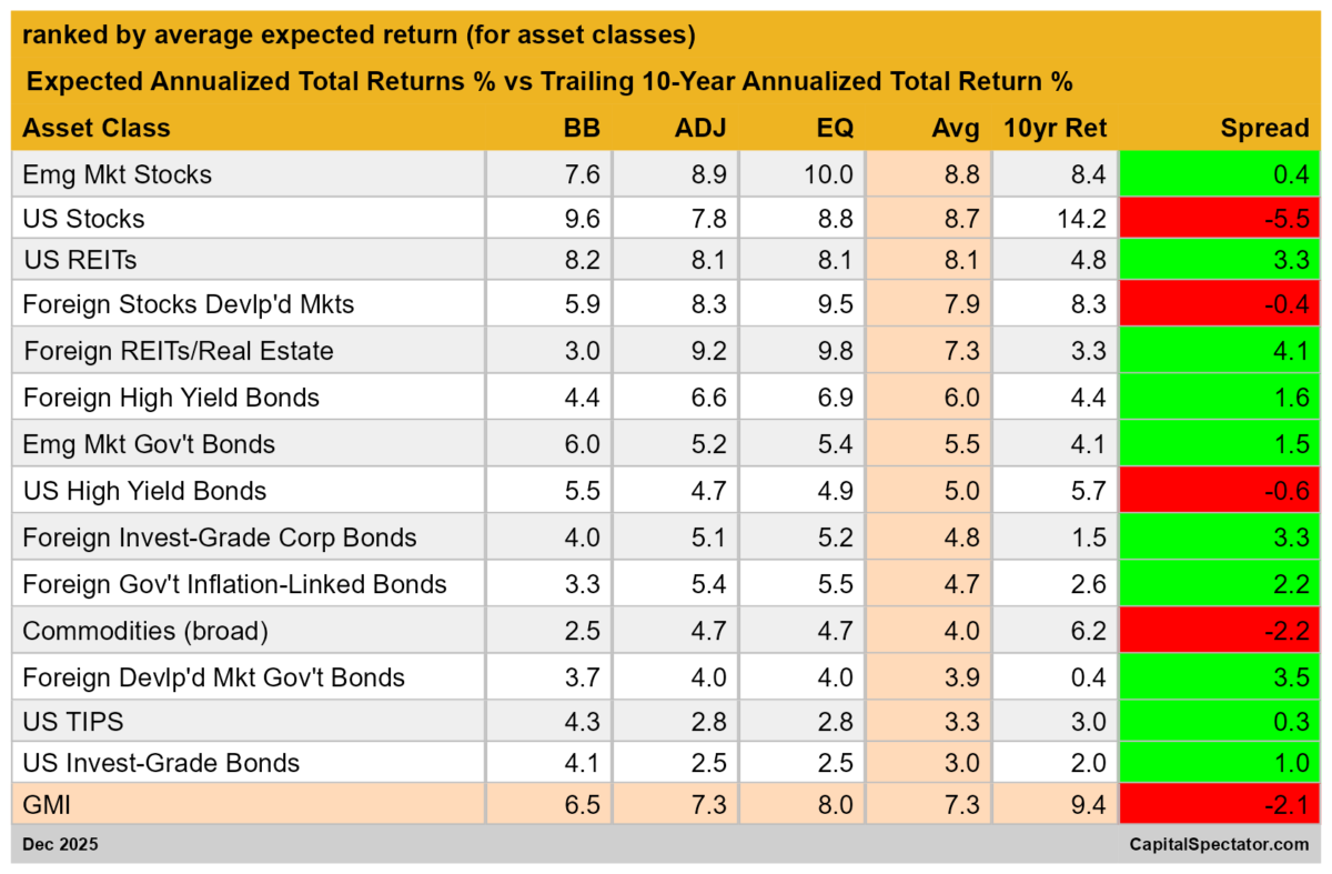 The majority of GMI’s components are projected to perform at a pace that’s above their respective trailing 10-year results. But in a possible sign that GMI’s return outlook will downshift in the months ahead, there’s been a rise in the number of asset classes posting expected returns that are below their trailing 10-year realized performances. At the extreme: US stocks, which are projected to earn an annualized 8.7% total return in the long-run future, which is 5.5 percentage points below the 14.2% annualized gain over the past decade.