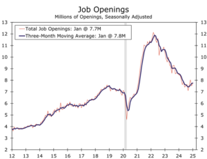 What’s changed? Higher uncertainty for the economic outlook based on worries about the fallout from a trade war tops of the list of concerns. The Fed, however, is still expected to leave its 4.25%-to-4.50% target rate unchanged at the next policy meeting on Mar. 19, pricing in a 97% probability, based on futures data this morning. The confidence for no change, however, falls to roughly 66% for the May 7 FOMC meeting.
