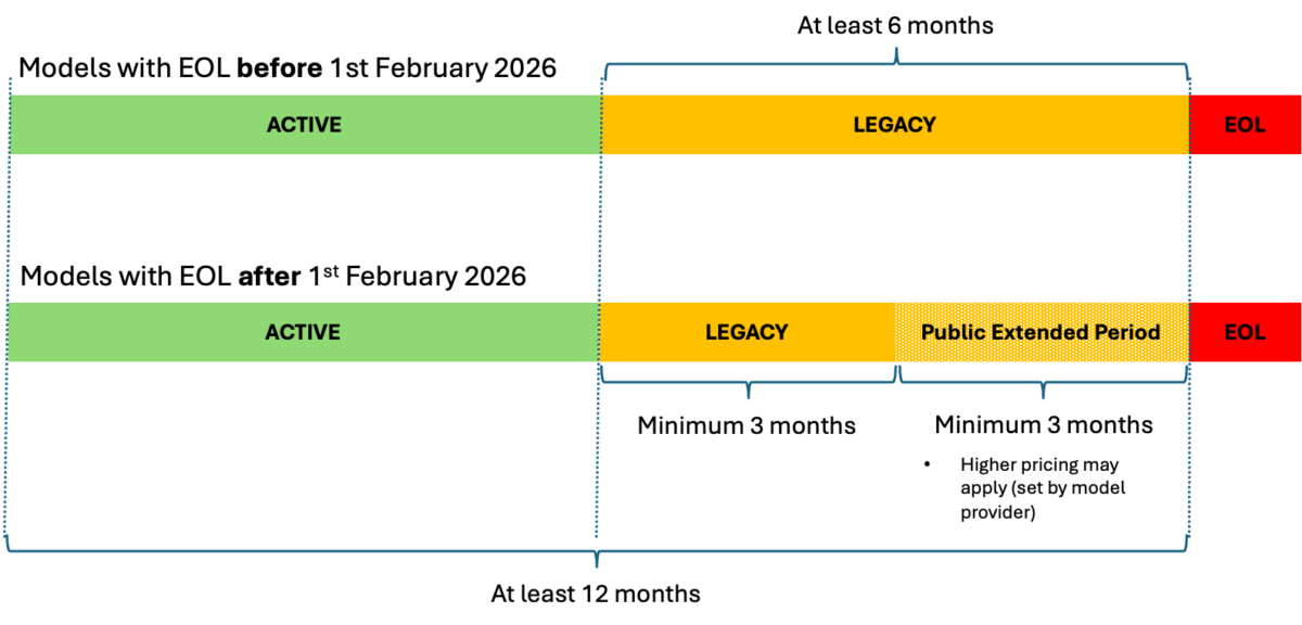 Customers will receive a notification 6 months prior to a model’s EOL date when the model provider transitions a model to Legacy state. This proactive communication approach ensures that customers have sufficient time to plan and execute their migration strategies before a model becomes EOL.