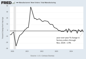 GDP for Q4 is projected to rise 2.1% (real annualized rate), based on the median estimate. If accurate, the rise will mark a substantial downshift from Q3’s strong 3.1% increase and will be the softest advance since Q1:2024’s sluggish 1.6%. The Bureau of Economic Analysis is scheduled to publish 2024’s preliminary Q4 data on Jan. 30.