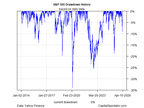 “Expressed in standard deviation of daily returns, or how much the index’s fluctuations vary from their average, volatility for 2026 through April 10 registered at 15% on an annualized basis,” writes Dan Lefkovitz, a strategist at Morningstar. “It turns out that 15% is right about average for US stock market volatility,” he observes, based on the average annual standard deviation of daily US stock market returns for the past century.